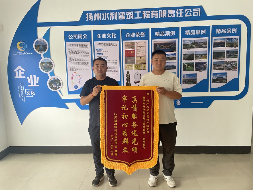 6月25日下午,经开区朴席镇李桥村村民委员会将一面印有“真情服务送光明、牢记初心为群众”字样的锦旗,郑重交到扬州经济技术开发区长江运河交汇区(西南片)防洪除涝能力提升一期项目施工Ⅰ标项目部项目负责人的手中,这面鲜红的锦旗,承载着村民对项目部为民解忧的诚挚谢意。