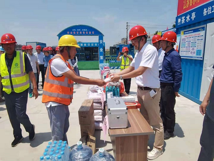 慰问组来到扬州闸泵站工地现场给施工人员送上防暑降温用品、安全隐患图集以及法律法规宣传手册,与水利建设中心、项目部、监理单位开展座谈,听取参建单位关 于工程质量、进度和安全生产方面的汇报。刘胜松副局长对扬州闸泵站工程现场质量与安全管理给予充分的肯定和高度评价,对高温期间坚守岗位的一线水利工程建设者表示诚挚慰问,同时强调在战高温、保质量、促进度的同时,做好安全防范,确保安全生产。