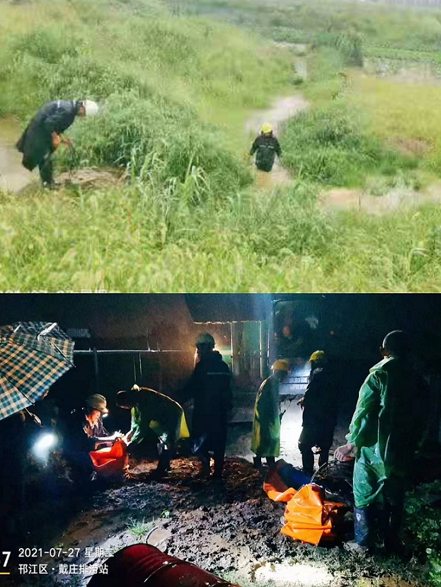 28日凌晨2:10,项目部同时接到邗江区蒋王街道四联村、仪征市新集镇八桥村求助电话,由于持续强降雨导致大片农田和种植大棚被淹,请求项目部帮助。接到电话后,项目部立即启动应急预案,组织28名抢险救援人员、3台防汛值班挖掘机及附近值班点调来的10台8寸潜水泵兵分两路对两处受灾点进行救援,从2:50第一台泵开始出水到5:10最后一台水泵出水,项目部仅用了2小时20分完成了所有水泵安装,并成功开始排水,为减少农户损失争取了宝贵的时间。经过水泵24小时连续抽排,大棚内积水问题得到顺利解决,保障了当地种植户的财产安全。