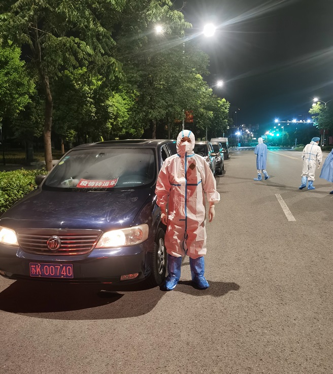 转移隔离人员是一项十分危险的工作,需要打起十二分精神谨慎对待。为了避免引起群众恐慌和迅速完成任务,杨士俊大多数时候出车都是在深夜。凌晨1:30,“你好,现在有5名密切接触者需要紧急隔离,请问你现在能赶过来吗?”一通电话叫醒了刚入睡的杨士俊,“好的,没问题!”他的声音洪亮且果断,即使是深夜,也让自己迅速进入工作状态,顺利完成任务。每当转移任务重的时候,即使没有自己的出车计划,他也坚持留在现场机动待命,“没关系,我再等一下,万一有需要呢”,厚厚的防护服内是早已汗湿的衣服,他却能在车内一等就是一整夜。半个月来,杨士俊已连续出车12趟,共转运隔离44人。