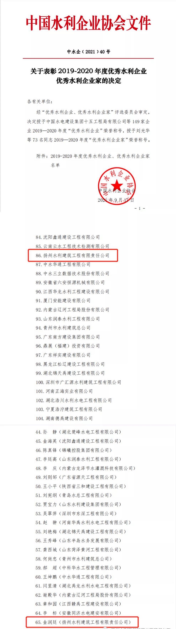 9月17日,中国水利企业协会发布《关于表彰2019-2020年度全国优秀水利企业、全国优秀水利企业家的决定》,星空在线注册(中国)官方网站-注册登录荣获“全国优秀水利企业”荣誉称号,公司总经理金润廷荣获“全国优秀水利企业家”荣誉称号。