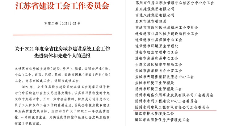 近日,江苏省建设工会工作委员会发文表彰省住房和城乡建设系统先进集体,星空在线注册(中国)官方网站-注册登录工会委员会被表彰为“模范职工之家”。