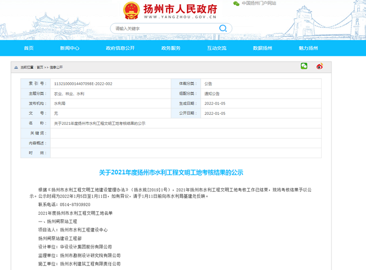 【概要描述】日前,扬州市水利局公布了2021年度扬州市水利工程文明工地考核结果的公示名单,星空在线注册(中国)官方网站-注册登录承建的扬州闸泵站工程、扬州市乌塔沟综合整治工程施工VI标2个项目榜上有名。
