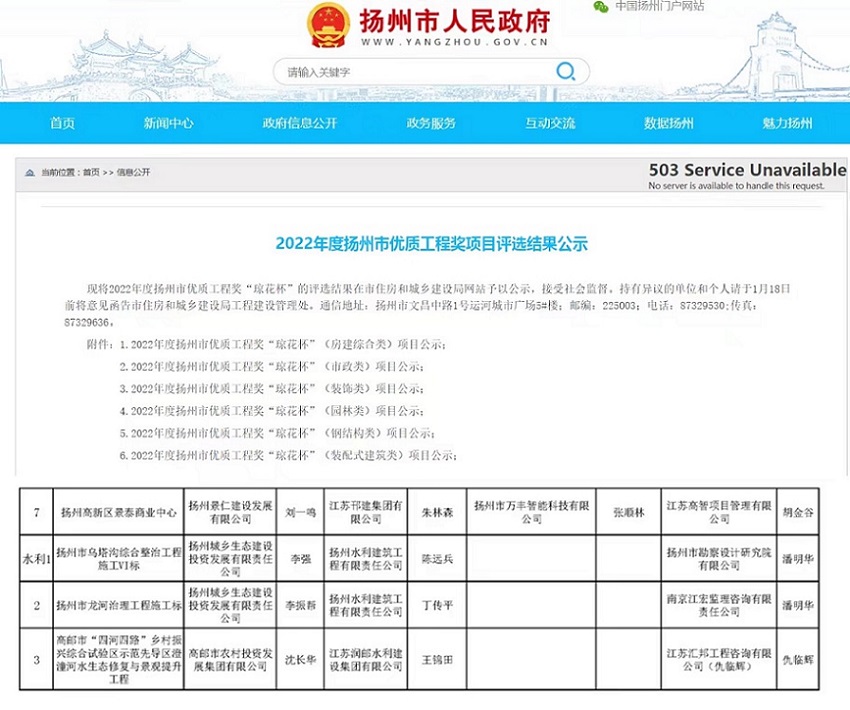 日前,2022年度扬州市优质工程奖项揭晓,星空在线注册(中国)官方网站-注册登录承建的市重点民生项目“扬州市龙河治理工程施工标”和“扬州市乌塔沟综合整治工程施工VI标”,均被扬州市住房和城乡建设局表彰为扬州市“琼花杯”优质工程奖。