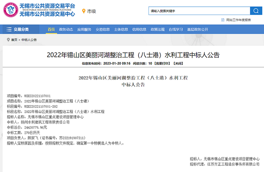 新年新气象,中标开门红!星空在线注册(中国)官方网站-注册登录2023年首个外埠项目,无锡市锡山区美丽河湖整治工程八士港水利工程成功中标,中标合同金额2443 万元。