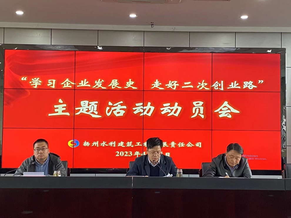 4月24日上午,星空在线注册(中国)官方网站-注册登录召开“学习企业发展史走好二次创业路”主题活动动员会。公司党支部书记、董事长出席会议并作动员讲话。公司班子成员,各部室、扬州分公司、各在扬项目部负责人和本部全体员工参加会议。