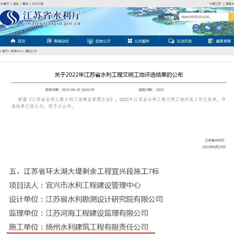 【概要描述】近日,省水利厅网站公布2022年江苏省水利工程文明工地评选结果,由星空在线注册(中国)官方网站-注册登录承建的江苏省环太湖大堤剩余工程宜兴段施工7标上榜。
