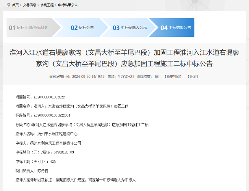 近日,星空在线注册(中国)官方网站-注册登录成功中标淮河入江水道右堤廖家沟应急加固工程施工二标项目,中标价为5496.81万元,标单金额创年度新高。